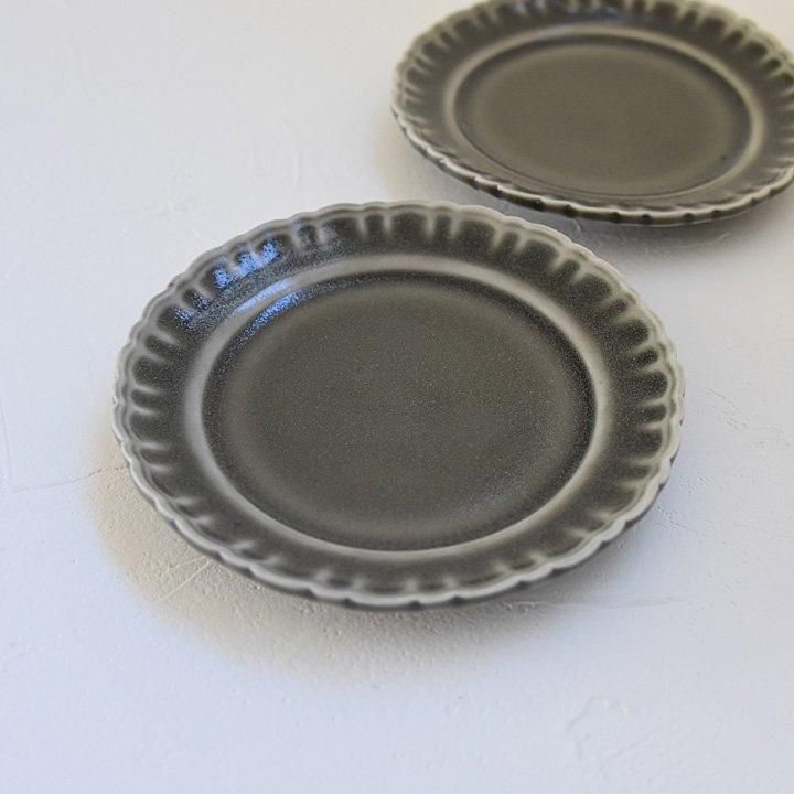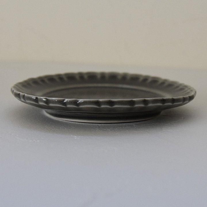 マーガレットのような花びらの形を模したリムがとても美しいまめ皿です。まめ皿という名前ですが、直径11.5cmと「小皿」サイズです。お色は濃い目の深緑です。季節のフルーツや取り皿にもよさそうです。また、小さなカップやグラスのソーサーとしてもよさそうだなと思います。