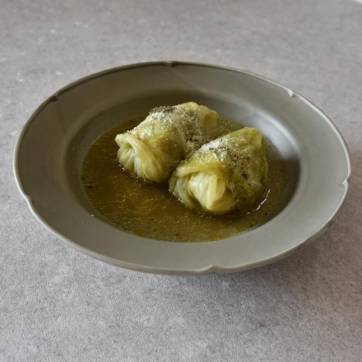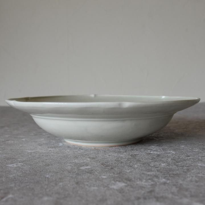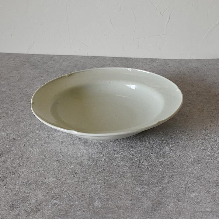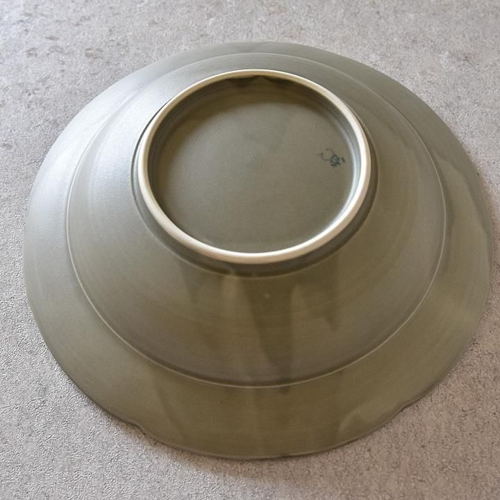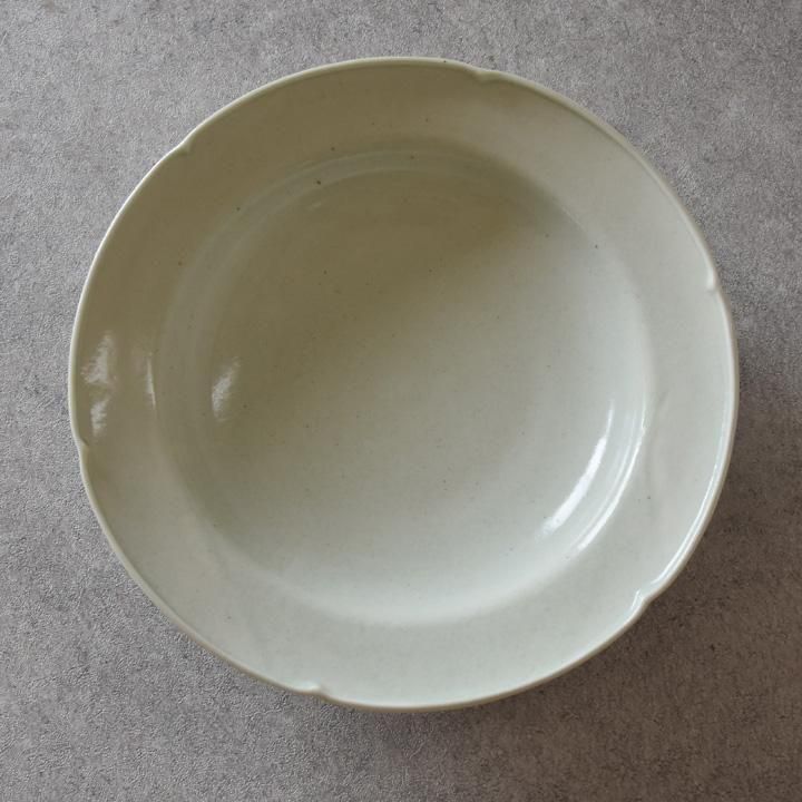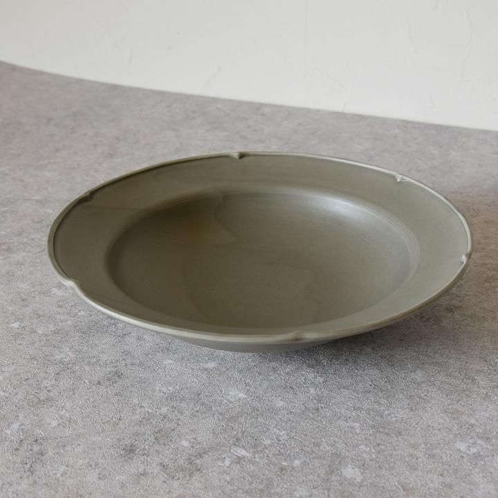 深さがあり、サラダなどを盛り付ける盛り皿としてもパスタやシチューなどの深さがあるお皿が重宝するお料理のときのも使える美しい花リム8寸皿です。