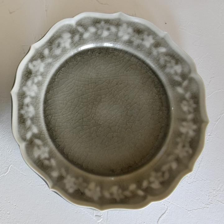 リムの花冠が美しい6寸サイズの平皿です。見込みがフラットなのでケーキ皿にぴったり。少しグリーンがかったライトグレーです。