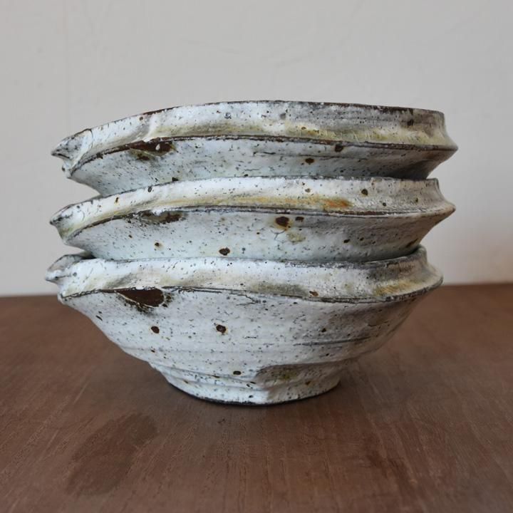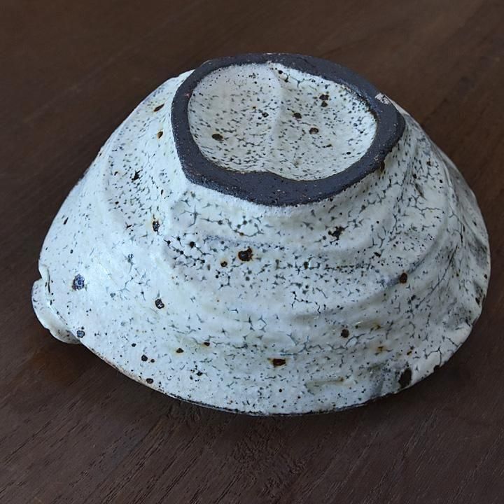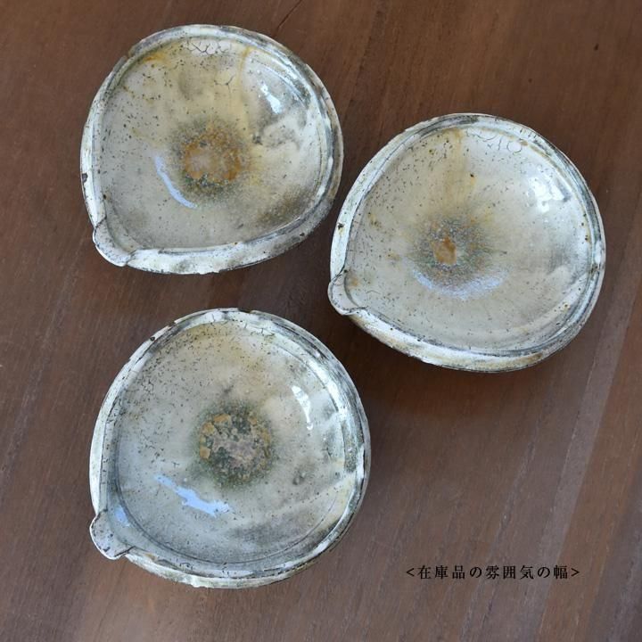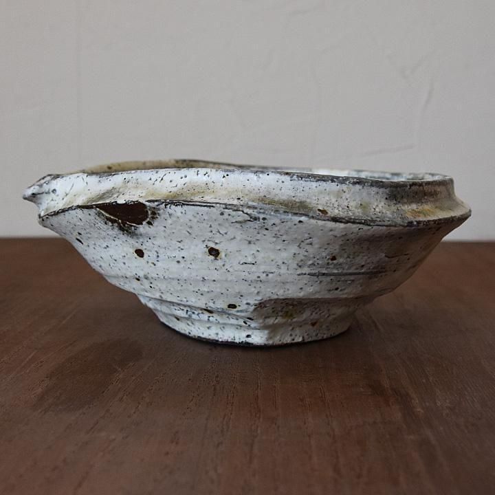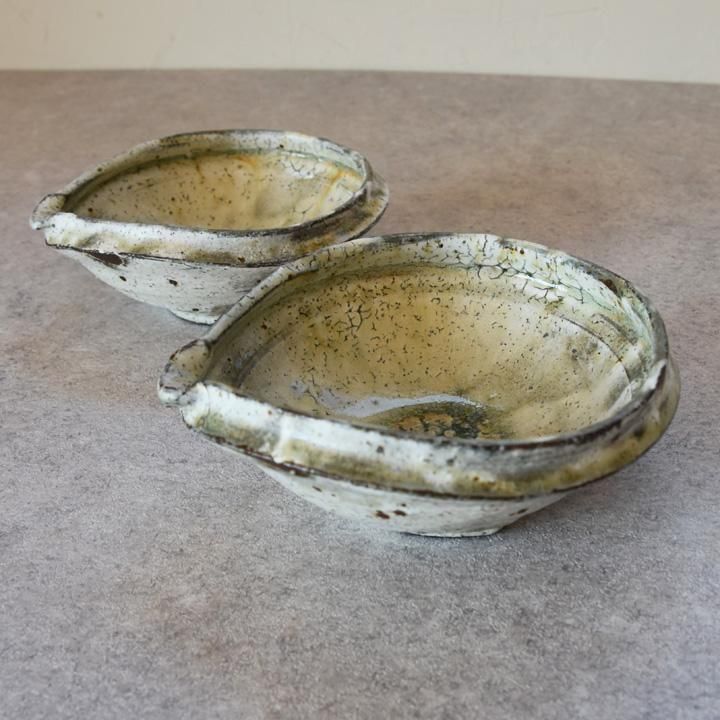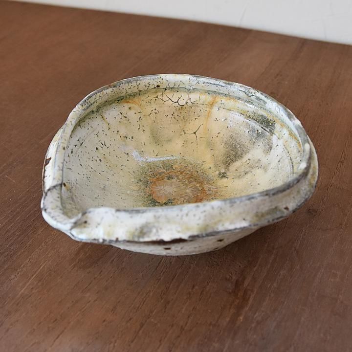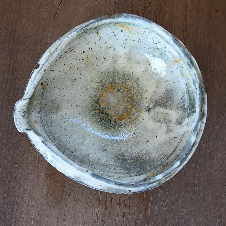 見込みがビードロという名前がついているだけあってガラス質のグリーン〜オレンジがかった黄土色の美しい釉薬と粉引のグレーがまじりあったような見た目のうつわです。釉薬のとけているところはグリーンに釉薬が溶けずに結晶のようになってたまっているところがオレンジ系の黄土色にといった具合です。見込みの釉薬の溶け具合によりガラス質のところもグリーンが濃いグリーンから黄色っぽいグリーンまでいろんな表情が見えます。サイズ感としては中鉢サイズの片口で口のあるところで直径15cmほど、ないところで直径13cmくらい。揚げだし豆腐や揚げだしれんこんみたいな料理を盛りたいなと思いました。家族分のひじきの煮物のような副菜おかずを盛るにもちょうどよいサイズ感です。野趣あふれるうつわです。