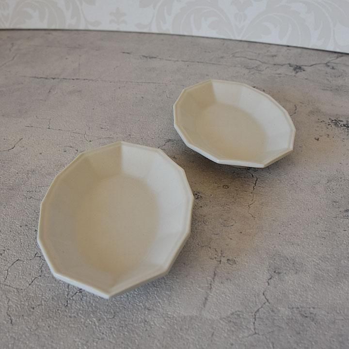 美しい白の十二角形の深さのあるまめ皿です。日々の小さい副菜おかずやタレ類も十分使える深さがありとても使い勝手のよさそうな小皿サイズ。釉薬のかけむらがとても美しくうっとりします。
